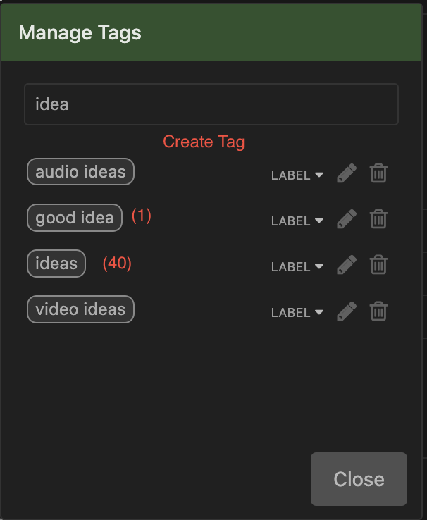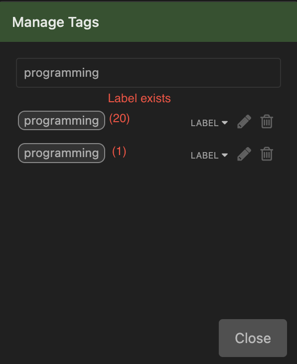 Moderate annoyance, but I think the tag editor could be more robust. Hamburger > Manage Tags … Create tag button available when literal search fails at the top of all filtered tags. Other issue being redundant (identical) tags. A counter might be useful in the tag editor indicating how many items are tagged by each. I have two “programming” tags. “Alexa shopping list” (1) “Amazon shopping list (45).