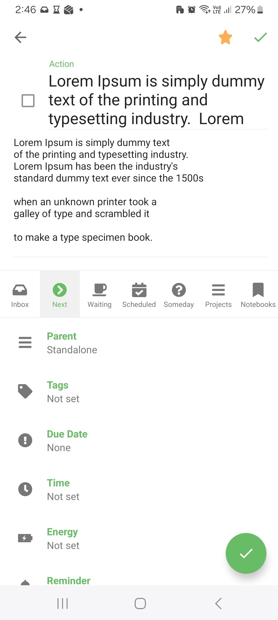 Hello. I’m using Android’s button navigation instead of gestures and found that the reminder option gets covered up by the navigation bar. Happens especially on tasks with long descriptions that are categorized as Waiting or Someday tasks (since they have many options). Also happens on other categories like Inbox if you have a long enough description. I forgot there was even a Reminder option for repeating tasks because of this